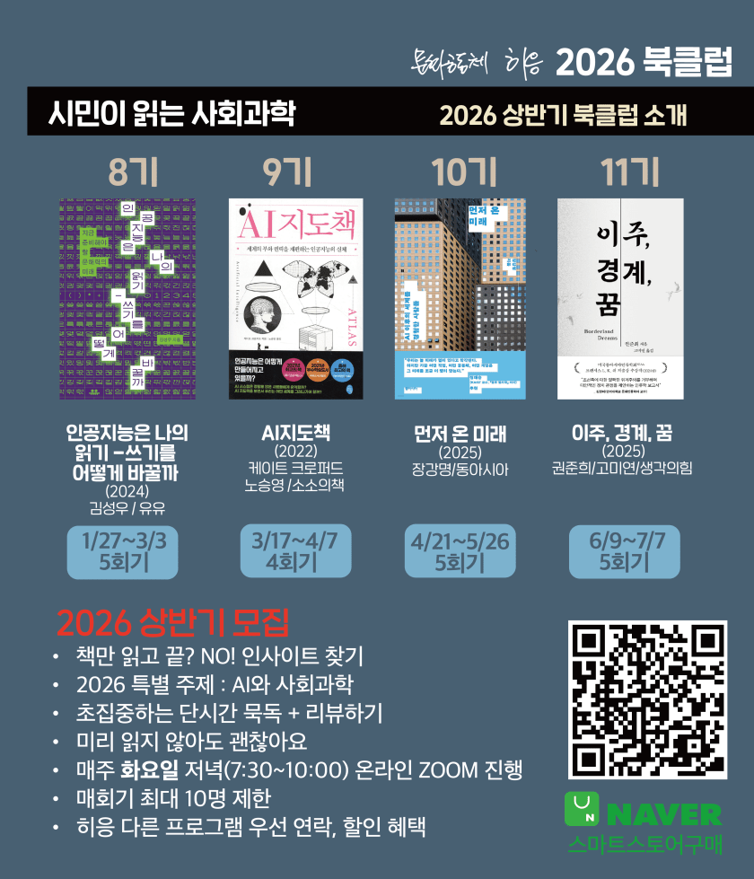 - [북클럽]8기 1회차 – 이끔이 소회2026년 첫 히응 북클럽 – #시민이읽는사회과학 의 첫 시간을 즐겁게 시작했습니다.첫날이니만큼 이 책에 대한 기대, 올해의 주제인 AI와 나의 일상에 대해서 먼저 이야기를 나눠봤습니다.첫 모임 이전까지 내가 목격한 인공지능 활용 사례나 그로 인한 충격이나 소감을 공유했는데 다음과 같은 사례들이 나왔습니다. 6. 주니어가 필요없어짐 얼마 전 들은 이야기로 대학 1학년생인 한 청년이 “대학은 GPT가 다니고, 나는 … 계속 “[북클럽]8기 1회차 – 이끔이 소회” 읽기