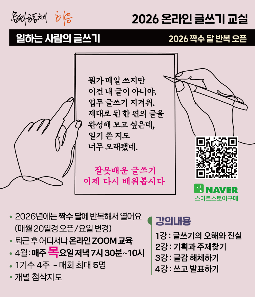 - 2026 생애사쓰기 1기 (홀수달 4주 – 최대 5명)내 삶을 나만의 문장으로 다시 기록하고 싶은 분을 위한 생애사쓰기 프로그램을 2026년에 다시 시작합니다 📕프로그램 개요 4주간의 온라인 강좌를 통해 내 삶을 해체하고 재구성하는 글쓰기를 배웁니다 간단한 실습과 메뉴얼을 통해 삶의 여정을 정리할 수 있습니다 🗓일정 3월 매주 수요일 저녁 7시 30분~10시 온라인 ZOOM 📚프로그램 특징 2013년부터 생애사쓰기 프로그램과 지도강사 프로그램 공동개발하고 전국 각 노인복지관, … 계속 “2026 생애사쓰기 1기 (홀수달 4주 – 최대 5명)” 읽기