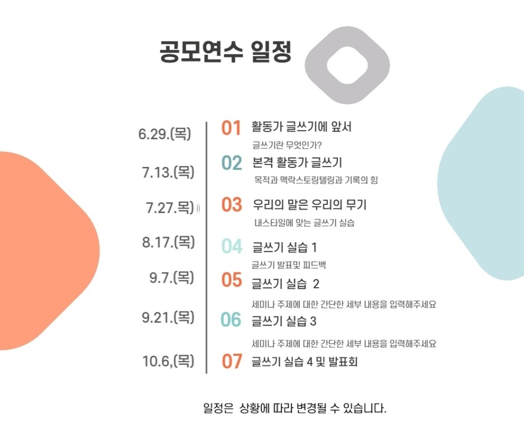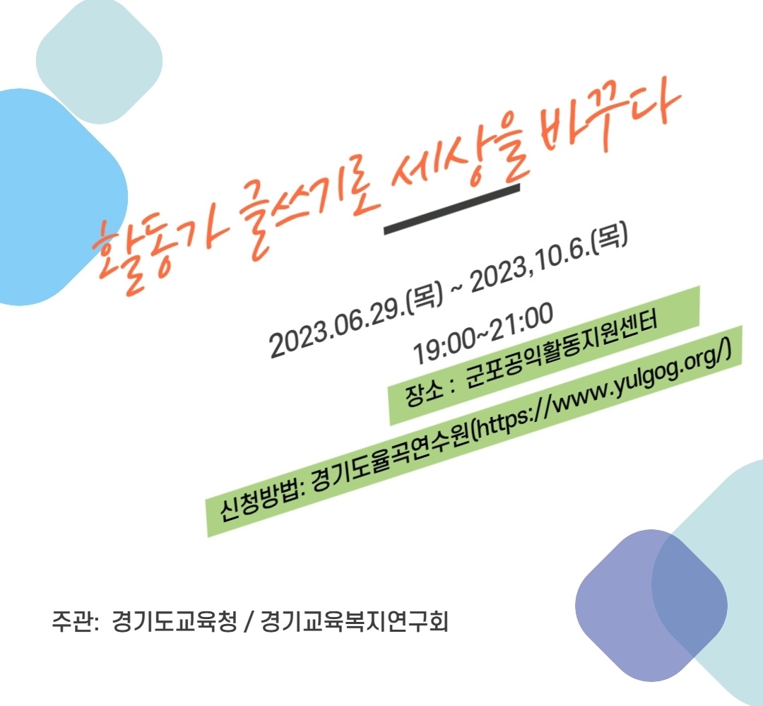 경기도율곡교육연수원의 지원을 받아 경기교육복지연구회에서 진행하는 활동가글쓰기 프로그램입니다. 1,2,3회차는 제가 강의를 진행하고 뒷부분은 자조모임을 구성해 함께 글을 써보는 시간을 갖습니다. 활동가글쓰기는 몇 가지 기술이 필요합니다. 도움이 될 수 있는 강좌를 마련해보겠습니다. 이후 하반기에 지역에서 활동가글쓰기 워크숍으로 연장해보고자 합니다. 많은 참여 부탁드립니다.
