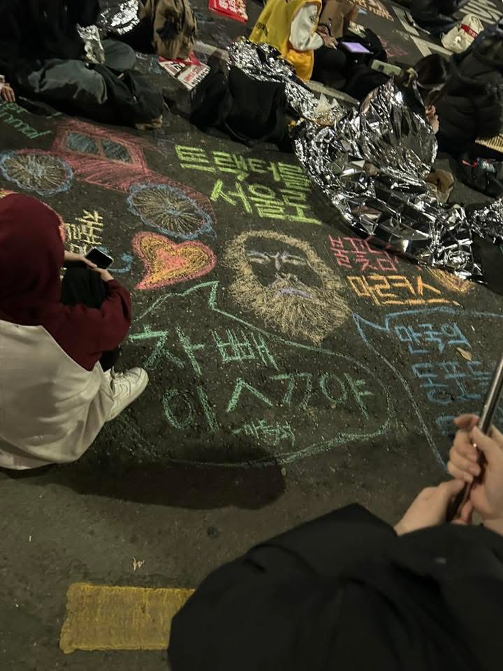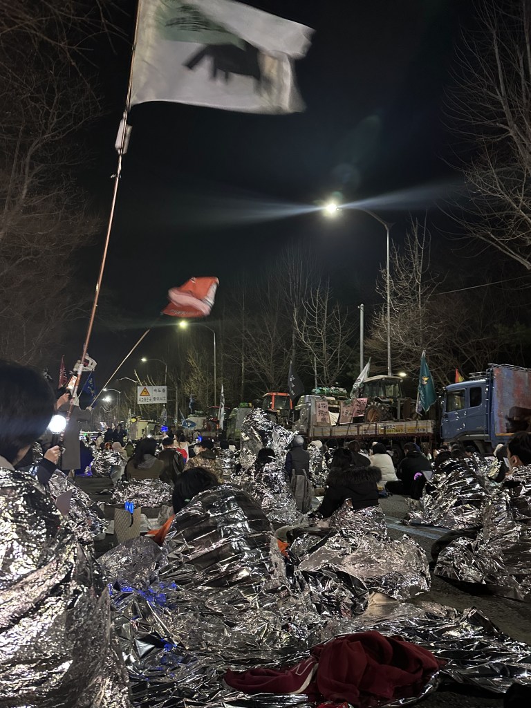 윤석열체포에 실패하고 무기력하게 돌아가는 공수처의 모습을 본 시위대는 1월 3일 저녁 7시부터 한남동관저에 모여들었다. 저녁 7시부터 시작된 한남동 관저앞은 밤이 되어도 집회를 중단하지 못했다. 시위대가 자리를 뜨지 않았다. 1월 3일부터, 돌아가지 않은 시위대는 4일 낮을 맞았다. 5일 되는 새벽, 눈이 내렸다. 각자 챙겨온 응원봉, 핫팩, 알루미늄 은박담요를 뒤집어쓴 시위대는 아스팔트 위에 스티로폼을 깔고 은박지를 뒤집어쓰고 고스란히 눈을 맞았다.