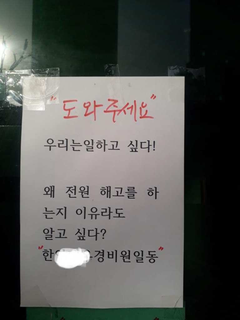 사진은 오늘 해당 아파트의 경비노동자들이 아파트 곳곳에 붙이고 있다는 전단이다. 해당 아파트는 20개동 1천여세대, 20년된 아파트로, 최소평수 30평형대부터 60평형대부터 있다. 평당 2천만원 정도로 거래된다.
