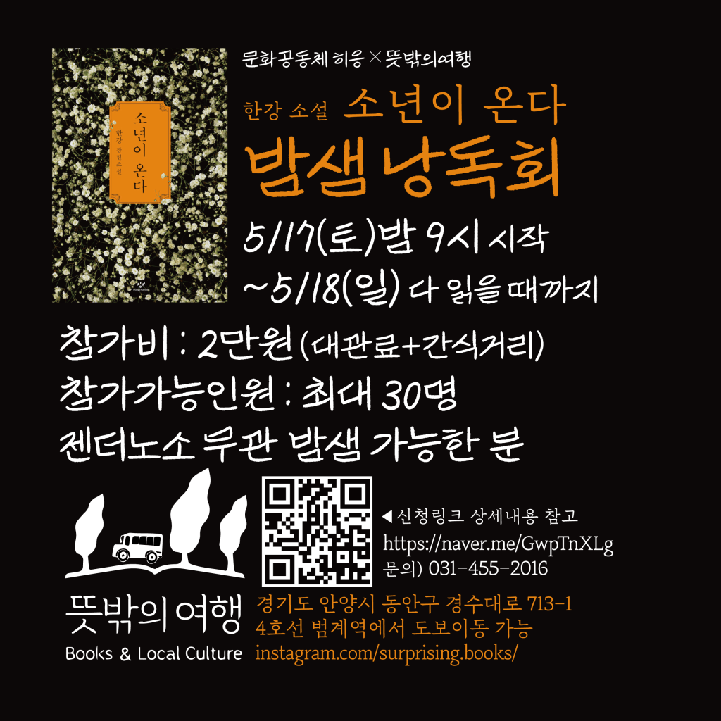 경기도 안양시 동네책방 <뜻밖의 여행>에서 한강의 소설 <소년이 온다>를 밤새 읽습니다