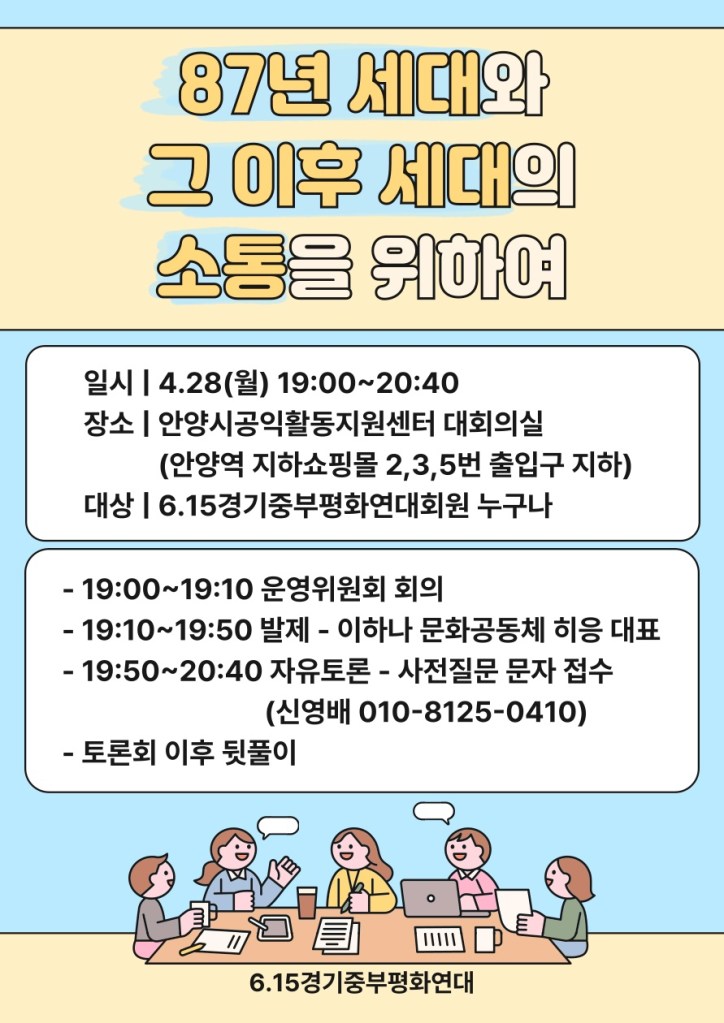 지역 연대단체 요청으로 87 6월항쟁세대와 그 이후 세대의 소통을 위한 토론회에서 발제를 맡았습니다. 관심있는 분들은 신영배 집행위원장에게 유선 연락을 통해 신청하세요.