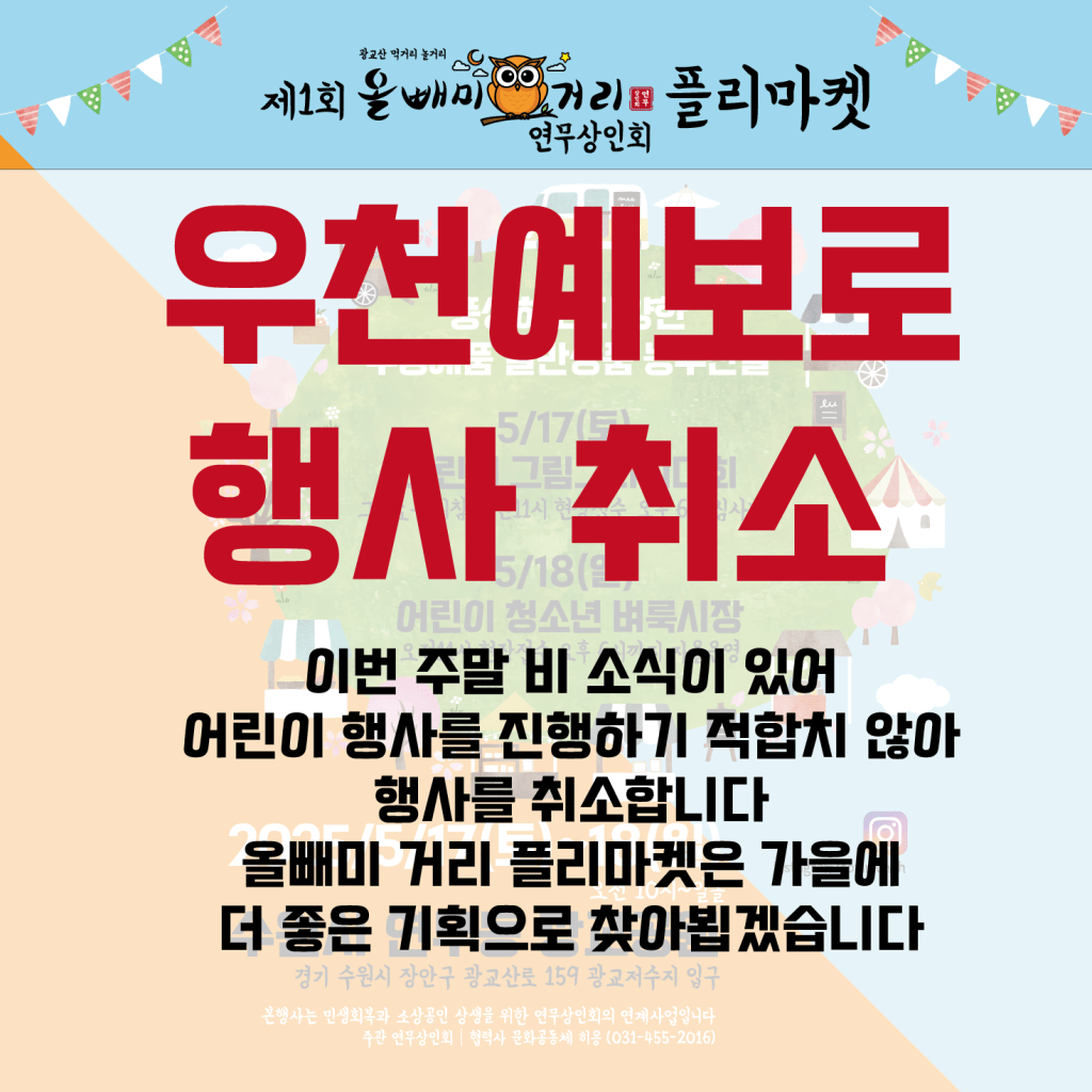 이번 주 목요일부터 비 소식이 있어 바닥에서 진행해야 하는 어린이 행사에 적합치 않아 행사를 취소합니다.