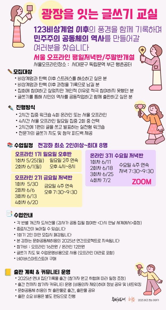 123 비상계엄이후 답답한 마음을 글로 표현하며 연대와 공감의 시간을 갖는 광장을 잇는 글쓰기 교실을 추가로 엽니다.