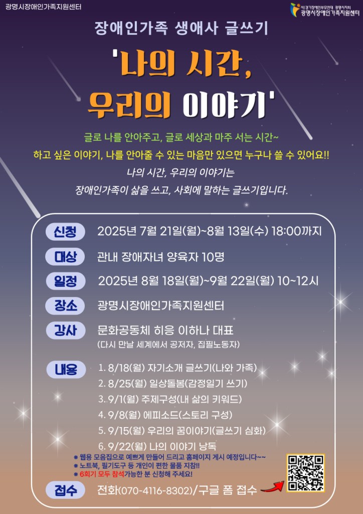 광명시장애인가족지원센터에서 주관하며 전 과정 무료입니다. 장애인가족의 삶을 공유하고 사회적 글쓰기를 통해 장애인권리찾기와 장애인과 그 가족의 사회적 역할에 대해 고민해보고자 합니다.