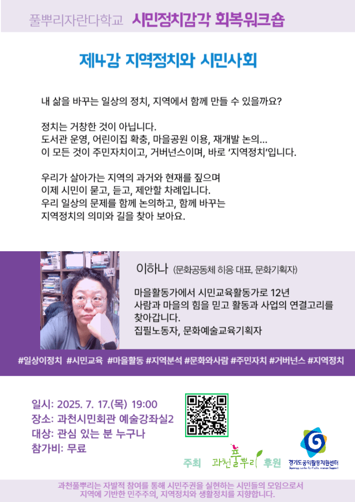 과천풀뿌리는 시민이 주인 되는 정치를 회복하고자 진행중인 [시민정치감각 회복워크숍] 그 네번째 강좌로 [지역정치와 시민사회]를 엽니다.