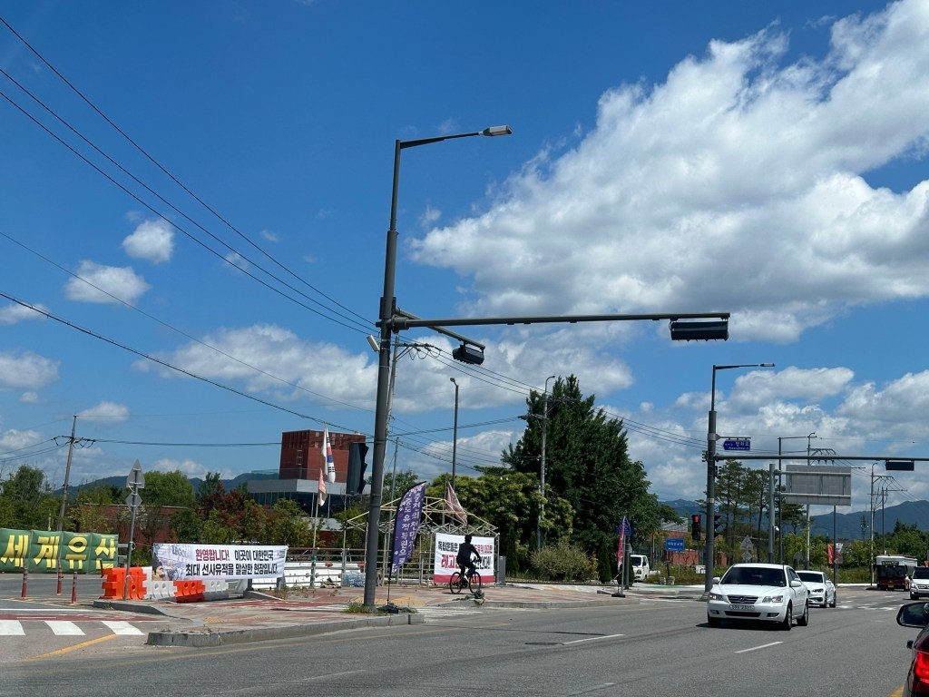 이번 춘천마임축제의 행사장은 춘천 북한강에 있는 섬, 중도의 레고랜드 주차장에서 열렸다. 말많고 탈많던 레고랜드는 거의 20년이 걸려 개장했고, 여전히 이에 반대하는 시민들의 현수막이 곳곳에 걸려있었다. 생태자연환경이 남아있던 하중도에 대한 개발과 구석기부터 철기까지 모든 시대의 유적지가 나왔다고 하는 대규모유적지에 외국자본이 투입된 것도 반감을 샀을 것이다. 이곳까지 우리를 데려다 준 택시기사는 “모든 것이 불법으로 이루어진 레고랜드”이며, “전세계 최대규모의 유적을 그저 밀어부쳐 지어버린 곳”이라고 일갈했다. 그는 우리에게 중도의 노을을 찍은 사진을 보여주며 오늘 같은 날 저녁에 노을을 보면 좋을 것이라고 일러주었다.
