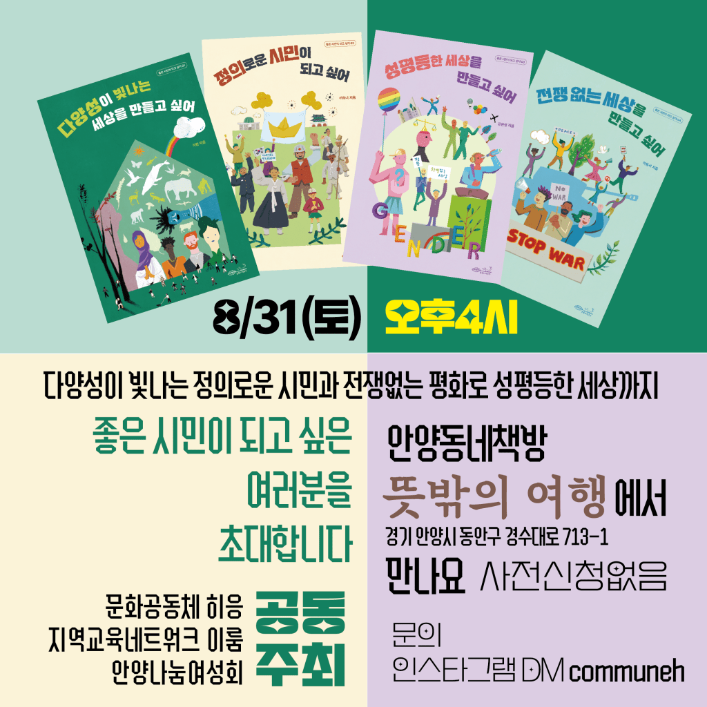 안양에서 시작한 민주시민교육과 문화다양성 교육이 기반이 되어 출간한 #초록비책공방 의 #좋은시민이되고_싶어 시리즈의 첫 북토크를 안양에서 엽니다.