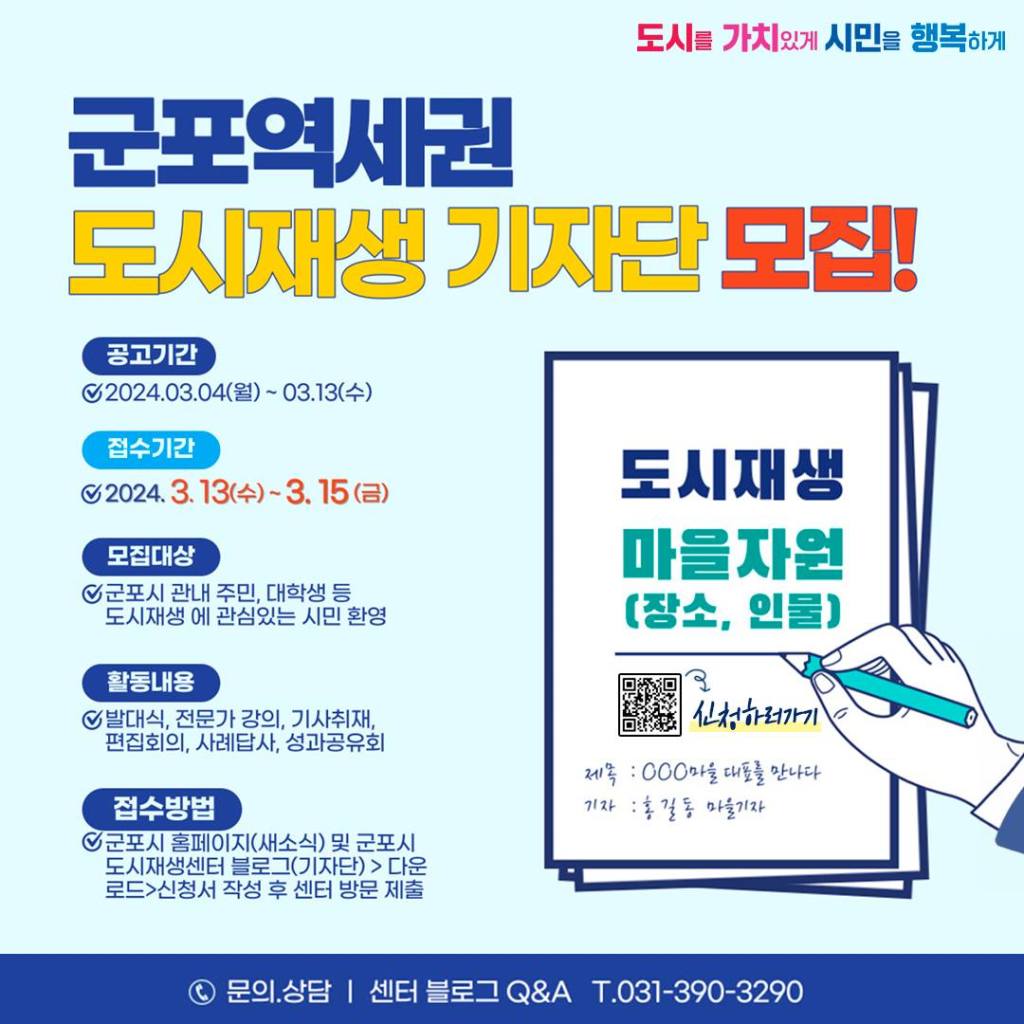 군포역세권 도시재생사업은 올해로 마무리됩니다. 도시재생 사업 첫단계부터 함께 해 온 군포역세권 도시재생 기자단은 그간 꾸준히 운영되어 왔습니다. 마을의 주민, 군포시의 생활청년들이 도시재생 기자단을 거쳤습니다. 마을을 바라보고 글로 표현하며 주민간의 소통창구 역할을 해 온 마을기자단과 함께 저도 많이 성장했습니다.