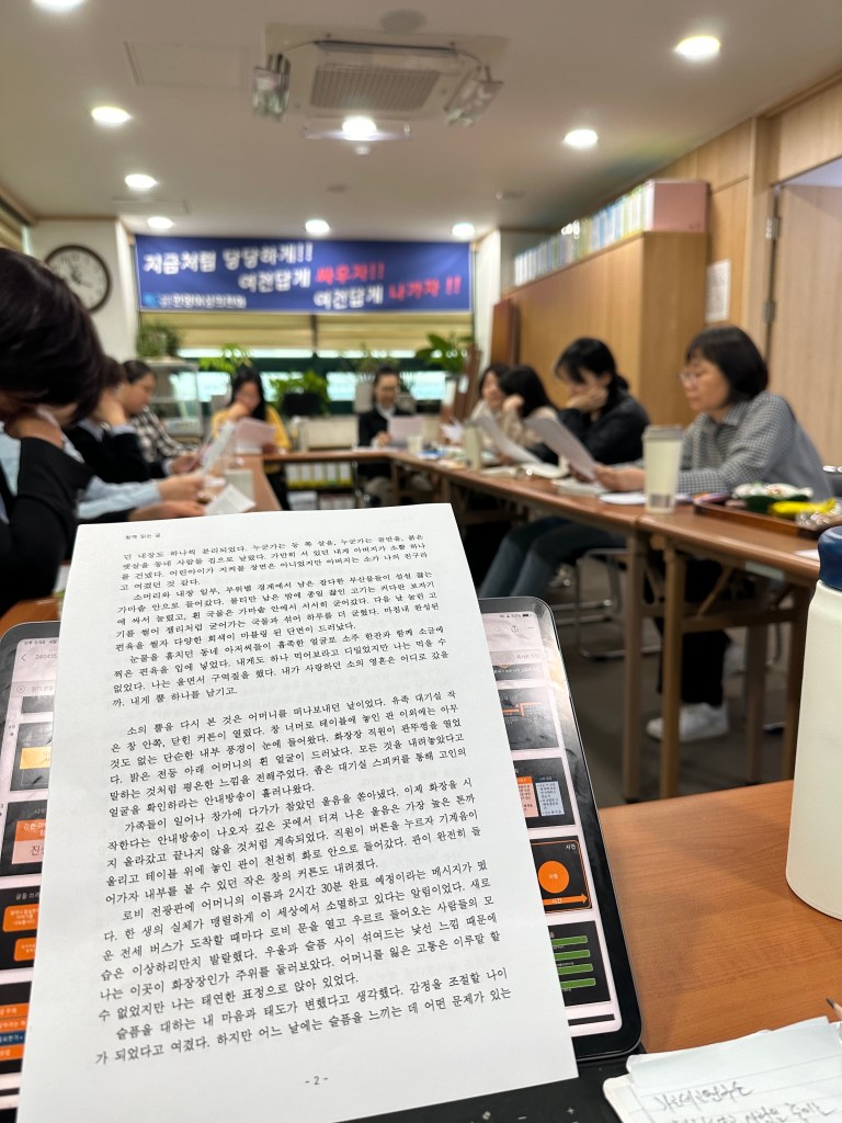 머리가 자주 아프다는 여성은, 10년전 강도사건을 당한 직후 조현병이 발병했다. 환청과 망상에 시달렸고 10년을 누워지냈다. 이제는 약도 잘 먹고 관리가 잘되는 편이다. 석 줄도 못 쓸거라고 하더니 가장 단정하게 글을 잘 쓴다. 지난 수업 그의 노트를 사진 찍으며 글쓰기 교육할 때 보여줘도 되겠냐고 물어 허락을 받았다. 자기 이름은 말하지 않아도 된다고 했다.
