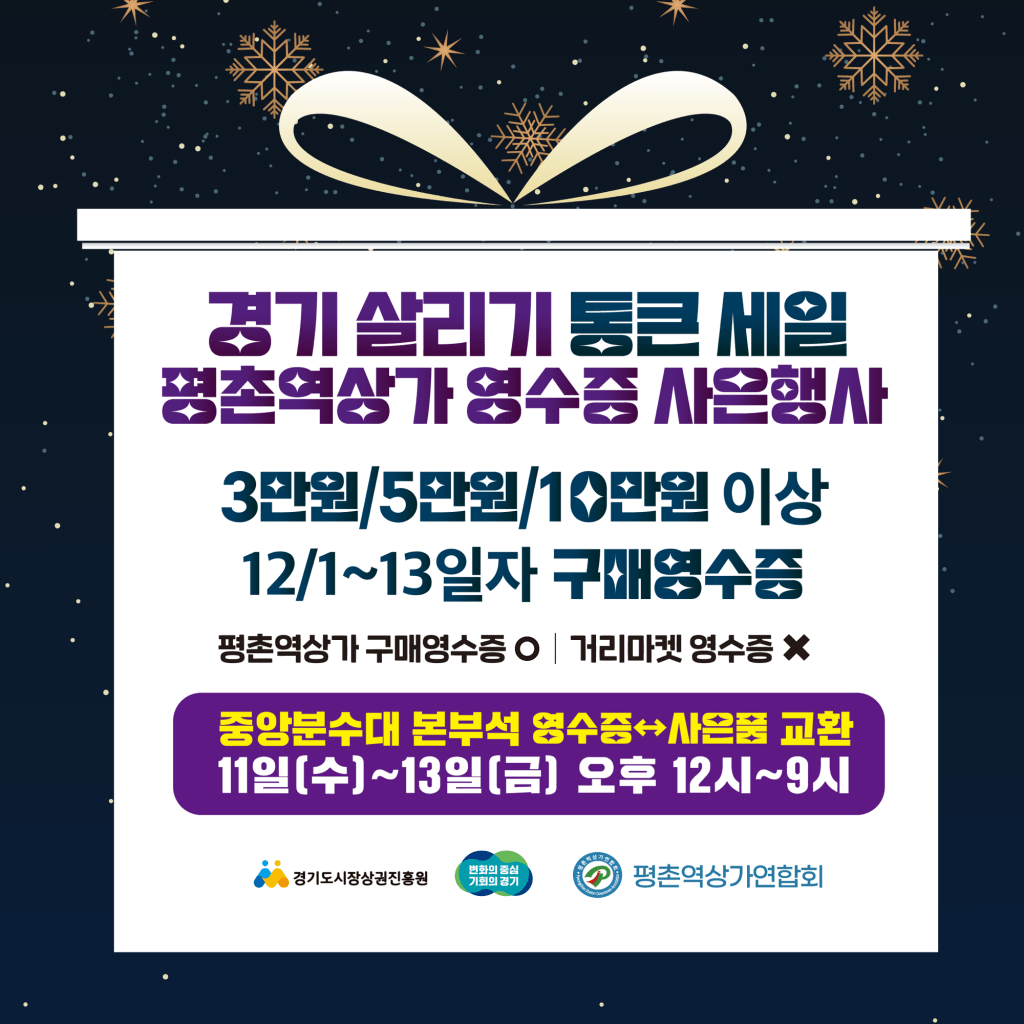 12월동안 #평촌역 상가에서 사용한 영수증은 12월 11일에서 13일 사이 #평촌역분수대 로 오시면 3만원이상, 5만원이상, 10만원 이상 사은품을 드립니다.