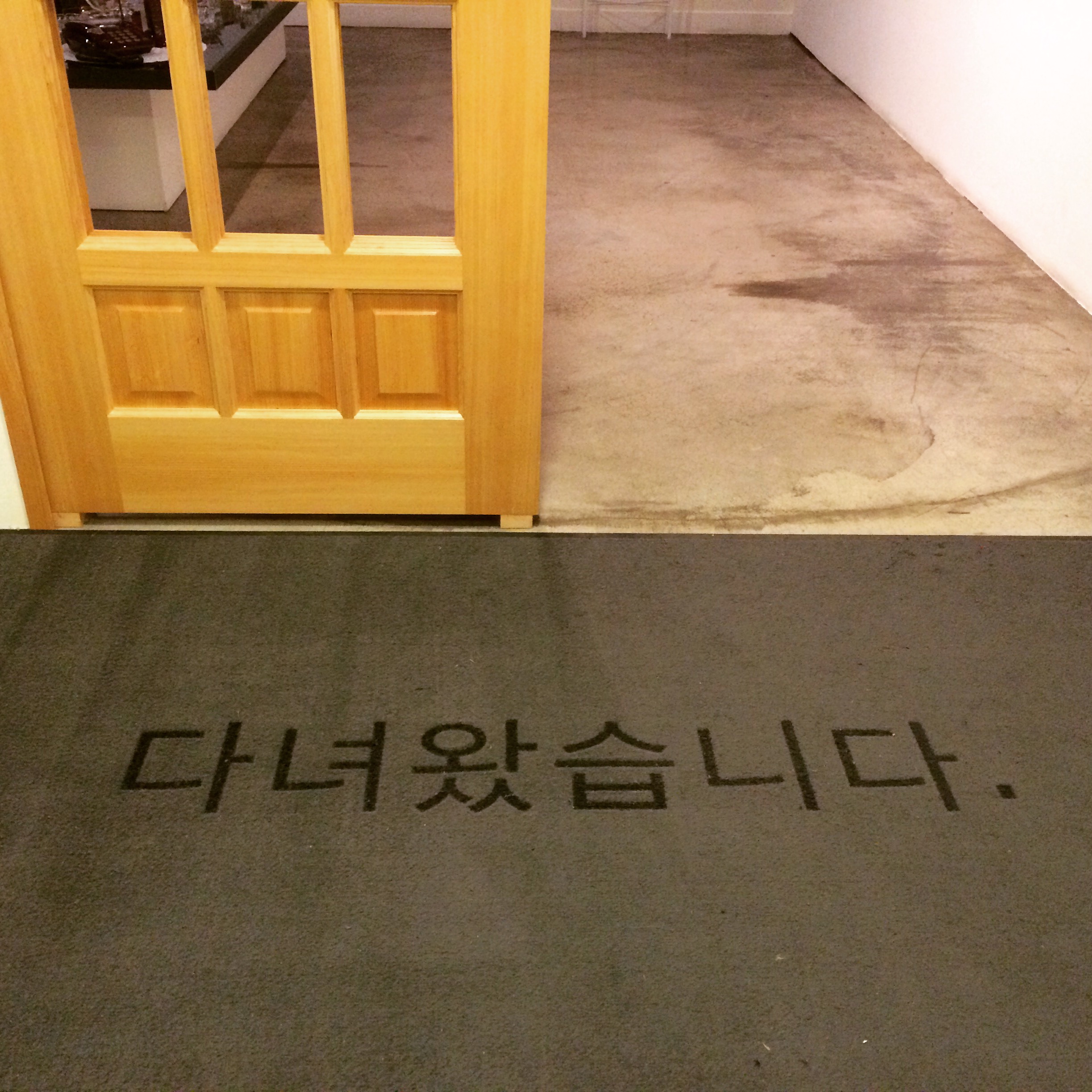 집안에 들어서는 것처럼, “다녀왔습니다” 라는 발판의 인사. 현관문을 열고 들어서면 거실이 나온다. 익숙한 물건들, 누군가의 집에 꼭 있던 물건들. 양주, 상패, 애매모호한 성질의 물체들이 줄지어 놓여있다. 낡은 브라운관 티비엔 사물에 대한 텍스트가 흘러나온다. 오래전 어떤 접대실에서도 흔히 볼 수 있던 색깔의 소파에 앉으니 갑자기 장식장이 있던 어느 거실로 돌아가는 듯 하다. “홍은동입니다.”라고 전화를 받던 앞치마를 맨 여자가 나타날 것만 같은 물성의 감촉.