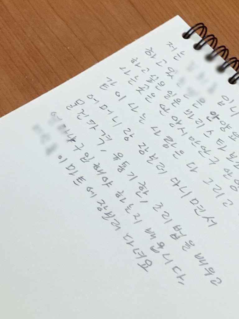 승민 씨는 문장을 완성하는 것이 온전하지 않지만 최선을 다해서 열심히 쓴다. 맞춤법을 잘 모르는 것도 있고 모르는 글자도 많아서 항상 나에게 물어본다. 내가 포스트잇에 또박또박 적어주면 아, 맞다, 하고 웃으며 열심히 적는다. 한 글자 한 글자에 얼마나 정성을 들이는지 볼 때마다 숙연해진다.