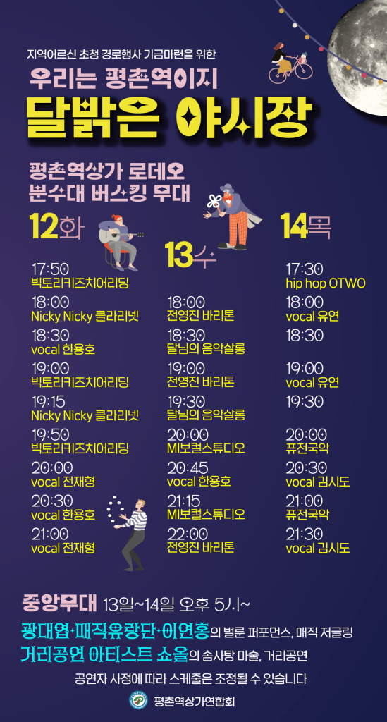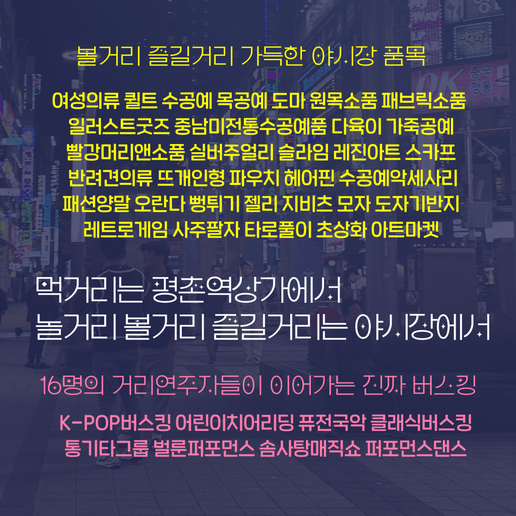 평촌역 중앙무대를 시작으로 하여 약 300m 구간에 펼쳐지는 이번 야시장에는 3일간 약 14개 팀이 끊임없이 거리공연을 선보일 예정이다. 버블퍼포먼스, 마술 저글링뿐 아니라 K-POP 버스킹, 퓨전국악, 어린이치어리딩, 클라리넷과 성악공연 등 풍성한 거리연주가 자율기부제로 운영된다.