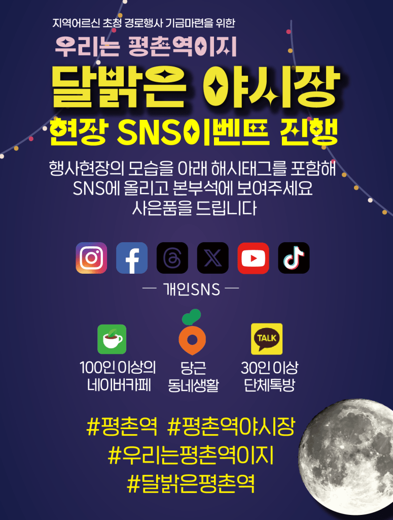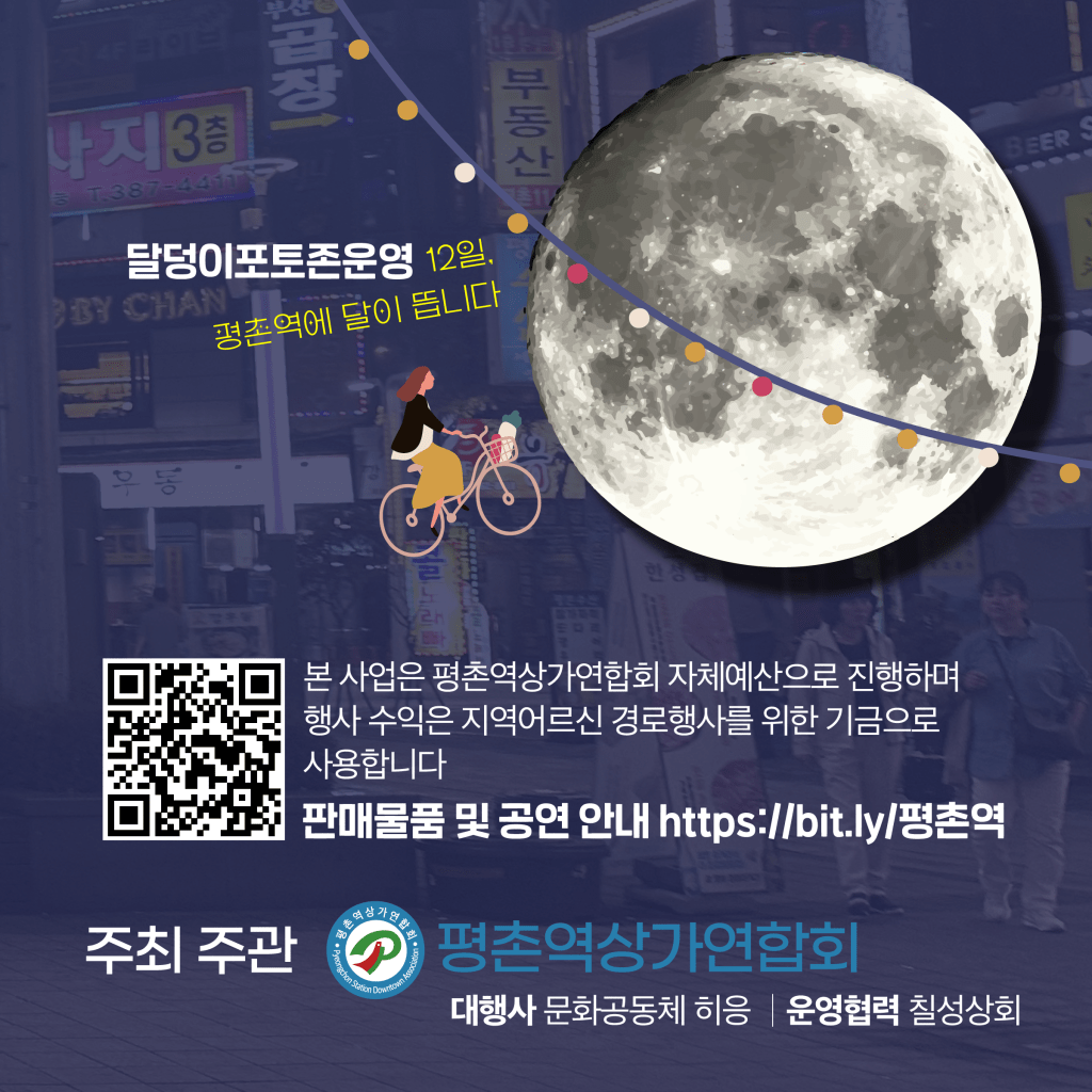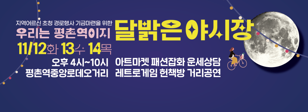 평촌역상가연합회 송동철회장은 “평촌역 상가는 먹거리는 풍성하나 쇼핑할 곳이 부족하다는 단점을 보완하기 위해 이번 행사를 기획했다.”며 “먹거리 중심의 상가활성화를 위해 야시장 판매에 조리 음식은 배제하고 판매가능한 물품으로만 구성했다”고 밝혔다. 평촌역을 즐겨찾는 세대의 정체성을 살려 ‘우리는 평촌역이지’라는 슬로건을 만들었으며 평촌역의 새로운 브랜드CI를 개발하여 시니어지로 사용하고 특별한 포토존을 마련했다. 12일 ‘평촌역에 달이 뜹니다’가 그 힌트다.